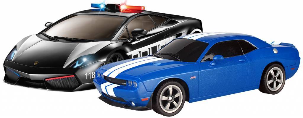 Radiografisch bestuurbare auto's van Auldey. Deze Police Pack bevat een Lamborghini LP560-4 Gallardo en een Challenger SRT8. Beide hebben een schaal van 1 op 16.